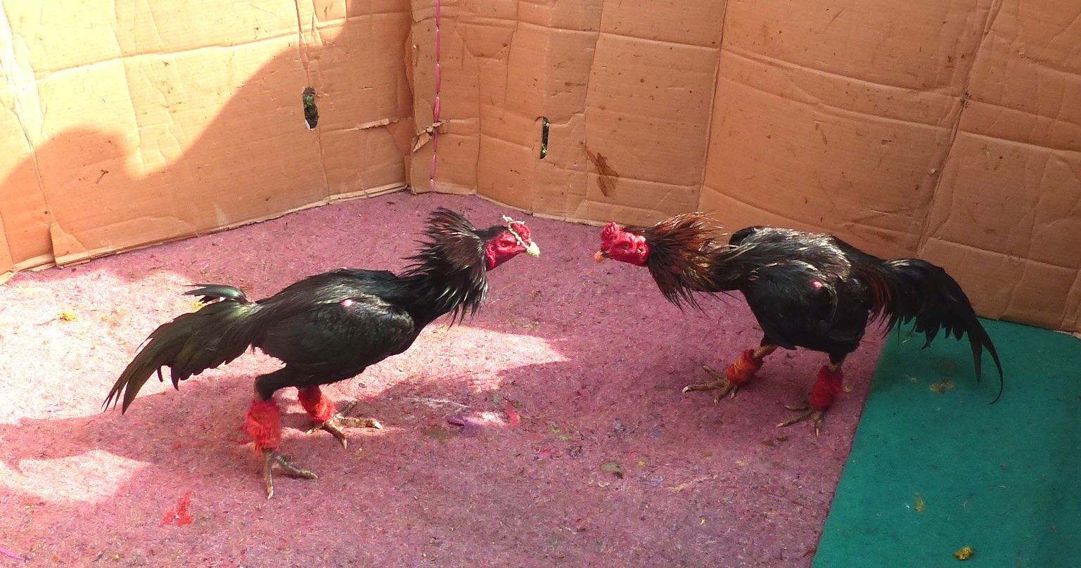 They put two birds in a cardboard ring for a timed minute─one man had a stop watch. The birds' beaks were tied shut and cloth covered their spurs.
